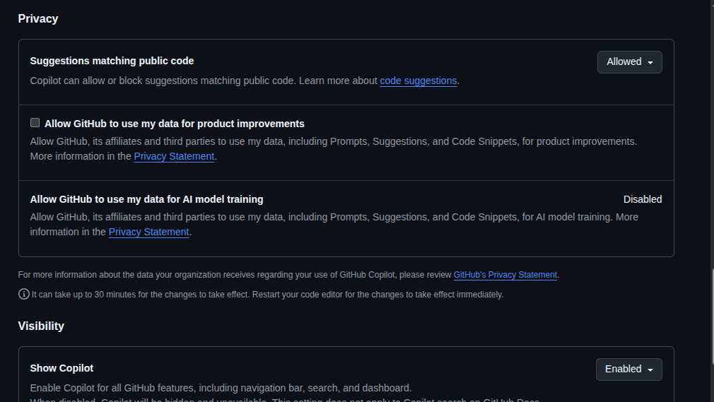 - Regularly review your privacy and telemetry settings to minimise data sharing. To check your privacy settings, log in to your GitHub account, go to settings, and then navigate to Copilot to adjust your preferences.